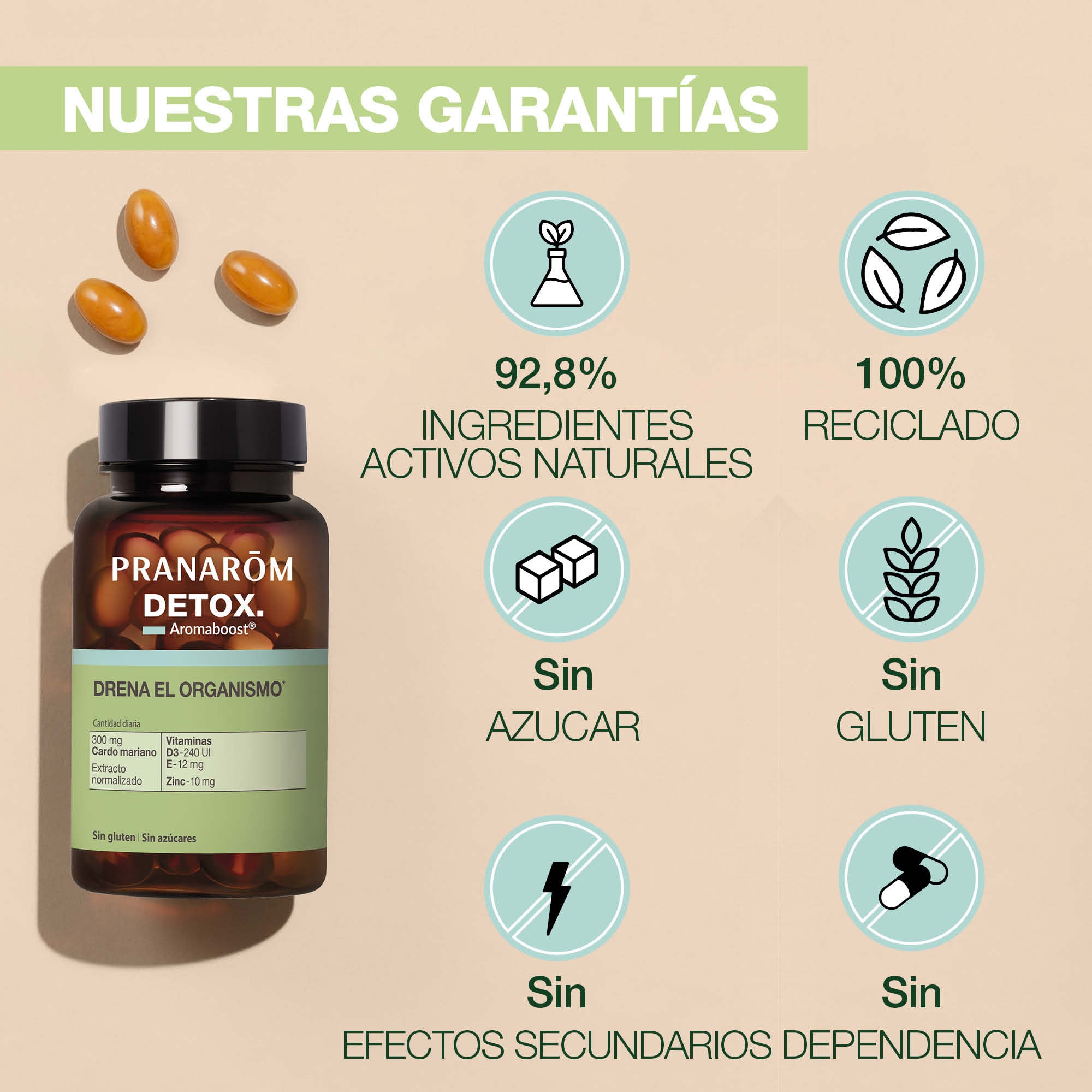 Elaboradas para ayudar a drenar el organismo, Aromaboost DETOX proporciona una solución para favorecer la eliminación de toxinas del cuerpo.Este suplemento alimenticio, sin riesgo de adicción, promueve el buen drenaje de los órganos de eliminación, con una cura recomendada de 1 mes.Las cápsulas Aromaboost DETOX obtienen su poder del extracto seco estandarizado de Cardo Mariano, Zinc, vitaminas D3 y E. La fórmula se potencia con una sinergia experta de Esencia de Limonero, y Aceites Esenciales de Enebro y Cardamomo.Aromaboost DETOX tiene una composición con un 92,8% de ingredientes de origen natural, sin azúcar y sin gluten.Composición detallada:- Extracto seco estandarizado de Cardo Mariano: hepatoprotector y regenerador hepático, el Cardo Mariano apoya la salud del hígado.- Vitaminas D3 y E: complementos ideales para un drenaje bien pensado, ofrecen sus grandes virtudes antioxidantes, anti-radicales y estimulan las defensas naturales. Dos cápsulas por día de la cura Aromaboost DETOX cubren al menos el 100% de las necesidades diarias de vitaminas.- Aceites Esenciales 100% naturales, puros e integrales: la fórmula Aromaboost DETOX está enriquecida con Esencia de Limonero, y Aceites Esenciales de Enebro y Cardamomo, seleccionados cuidadosamente para facilitar las funciones de eliminación del organismo y contribuir al buen funcionamiento del hígado, los riñones y los intestinos.- Aceites Esenciales 100% naturales, puros e integrales: la fórmula Aromaboost DETOX está enriquecida con Esencia de Limonero, y Aceites Esenciales de Enebro y Cardamomo, seleccionados cuidadosamente para facilitar las funciones de eliminación del organismo y contribuir al buen funcionamiento del hígado, los riñones y los intestinos.Completa tu ritual alimenticio con el Roll-on DIET, un gesto simple e instantáneo para disfrutar de un efecto supresor del apetito en cualquier momento del día.