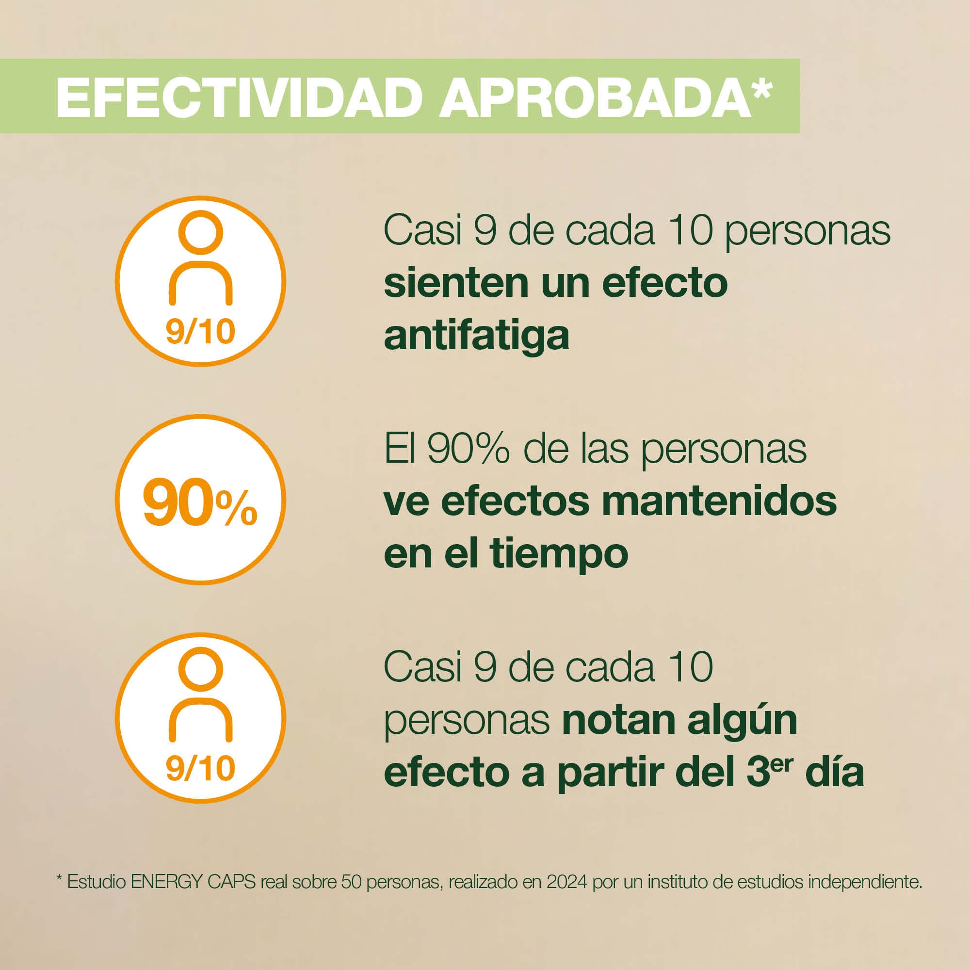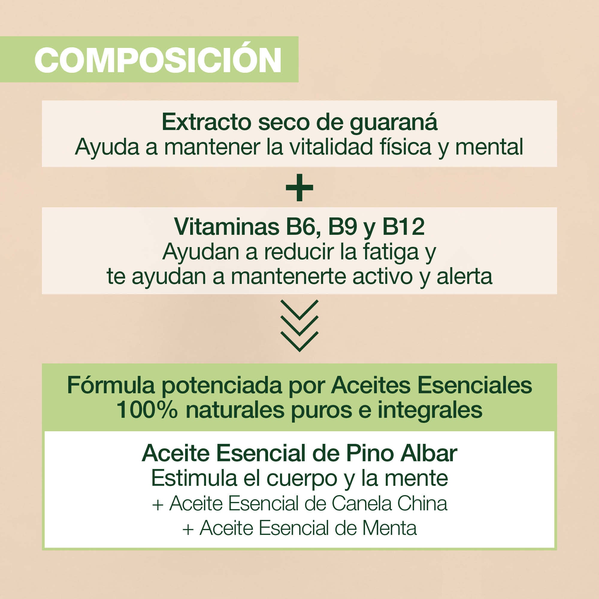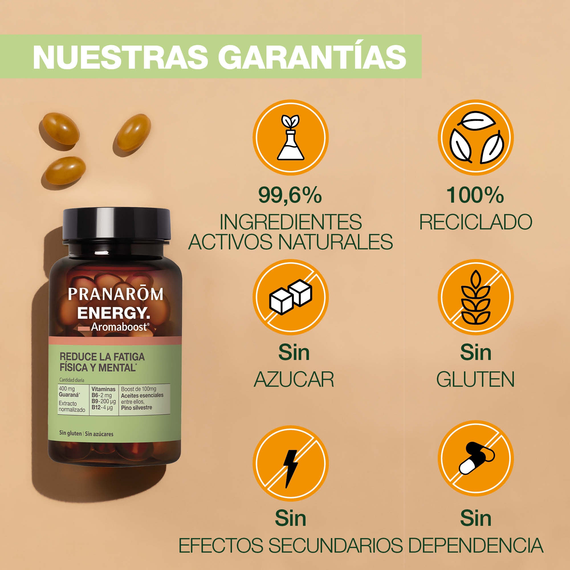 Diseñado para ayudar a reducir la fatiga física y mental, Aromaboost ENERGY proporciona un apoyo duradero para mantener tu energía durante todo el día.Ideal en períodos de fatiga intensa o para superar una disminución del rendimiento, este suplemento alimenticio sin riesgo de dependencia ofrece energía sostenida a largo plazo, con una recomendación de tratamiento de 1 mes.Aromaboost ENERGY ha sido sometido a una prueba de consumo:Cerca de 9 de cada 10 personas experimentan un efecto anti-fatiga.El 90% de las personas notan que los efectos se mantienen con el tiempo.Cerca de 9 de cada 10 personas notan un efecto rápido.Efecto percibido desde el tercer día.Efecto percibido desde el tercer día.Las cápsulas Aromaboost ENERGY obtienen su poder del extracto seco de guaraná y de las vitaminas B6, B9 y B12. La fórmula está potenciada por una sinergia experta de Aceites Esenciales de Pino Silvestre, Canela de China y Menta Piperita.Aromaboost ENERGY tiene una composición de 99,6% de ingredientes de origen natural, sin azúcar y sin gluten.Composición detalladaEl extracto seco de guaraná: el guaraná, conocido por sus propiedades tonificantes, ayuda a aliviar los síntomas de debilidad y a mantener la vitalidad física y mental.Las vitaminas B6, B9 y B12: estas vitaminas esenciales ayudan a reducir la fatiga y promueven un metabolismo energético normal, lo que te permite mantenerte activo y alerta. 2 cápsulas al día de la cura Aromaboost ENERGY cubren al menos el 100% de las necesidades diarias de vitaminas.- Aceites Esenciales 100% naturales, puros e íntegros: la fórmula Aromaboost Energy está enriquecida con tres Aceites Esenciales cuidadosamente seleccionados por sus propiedades estimulantes y tonificantes:- Aceite Esencial de Pino Silvestre: tradicionalmente utilizado como tónico, estimula y revitaliza tu cuerpo y mente.- Aceite Esencial de Canela de China: reconocido por sus efectos estimulantes, fortalece la resistencia contra la fatiga física y mental, permitiéndote mantener un buen rendimiento.- Aceite Esencial de Menta Piperita: apreciado por sus beneficios para el bienestar físico, sus propiedades estimulantes garantizan una energía duradera.Completa tu ritual alimentario.Roll-on ENERGY: Un gesto simple e instantáneo para recuperar energía, para llevar a todas partes.Bruma energizante ENERGY: Una solución para rociar diariamente o en caso de necesidad, con fragancias estimulantes para crear un ambiente energizante.* Prueba de consumo realizada por un instituto independiente en 50 personas durante 30 días.