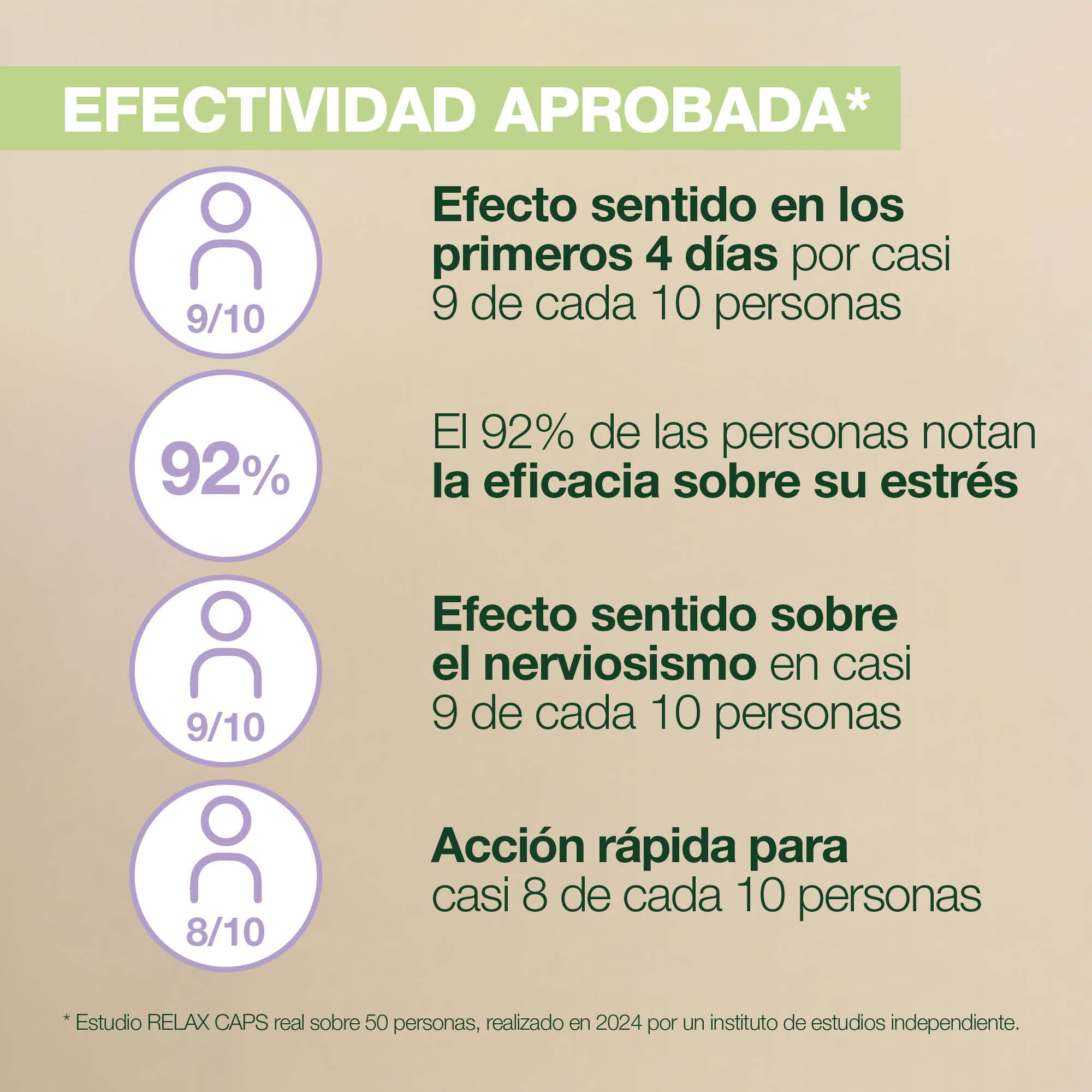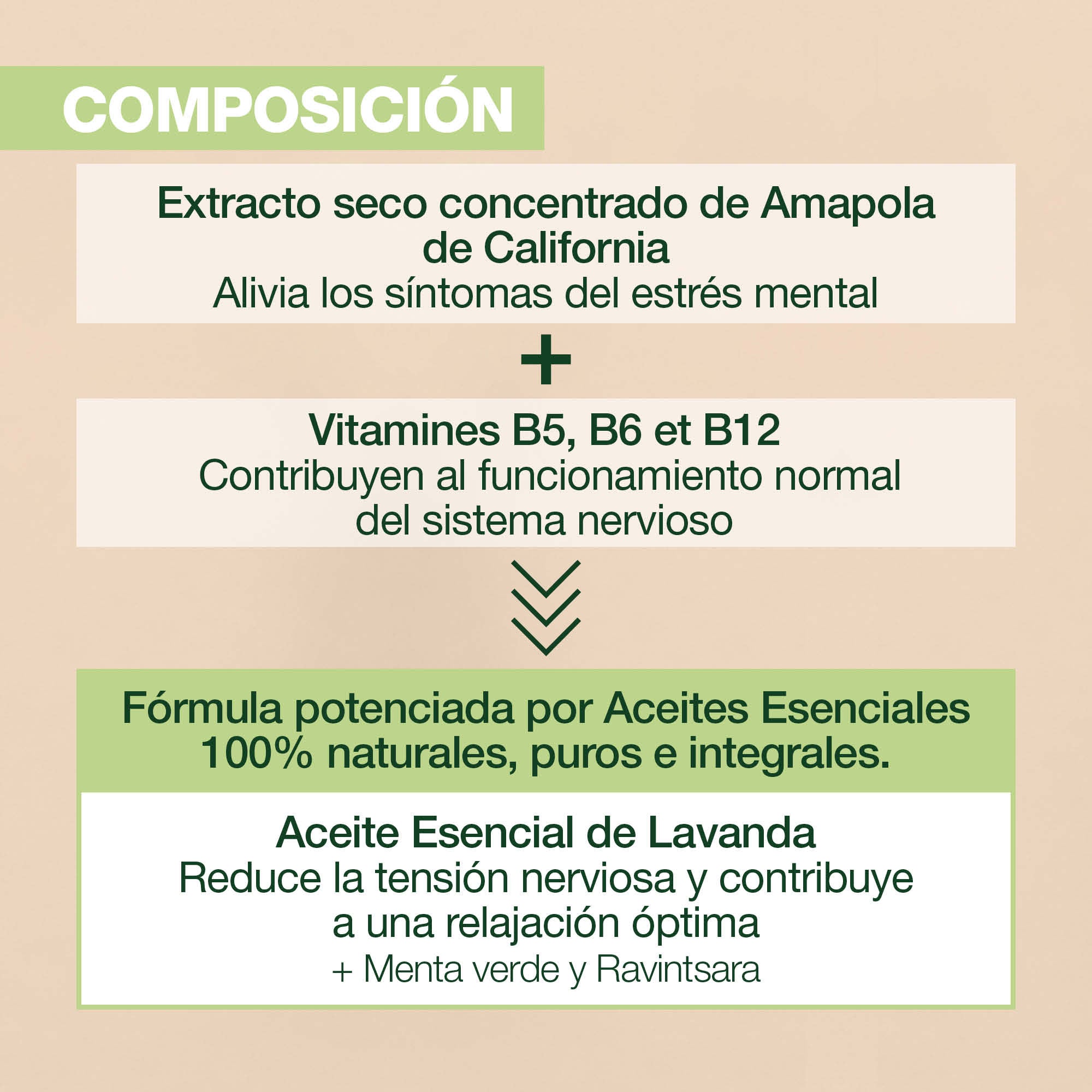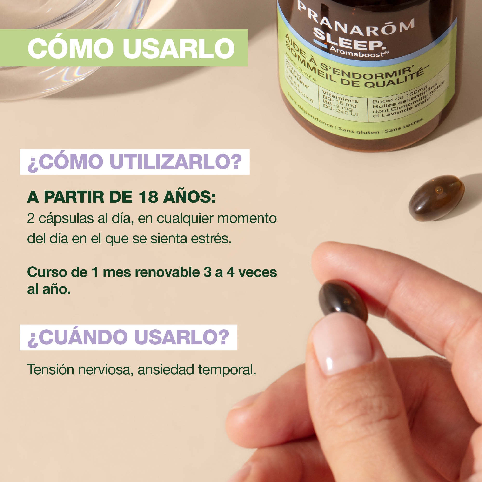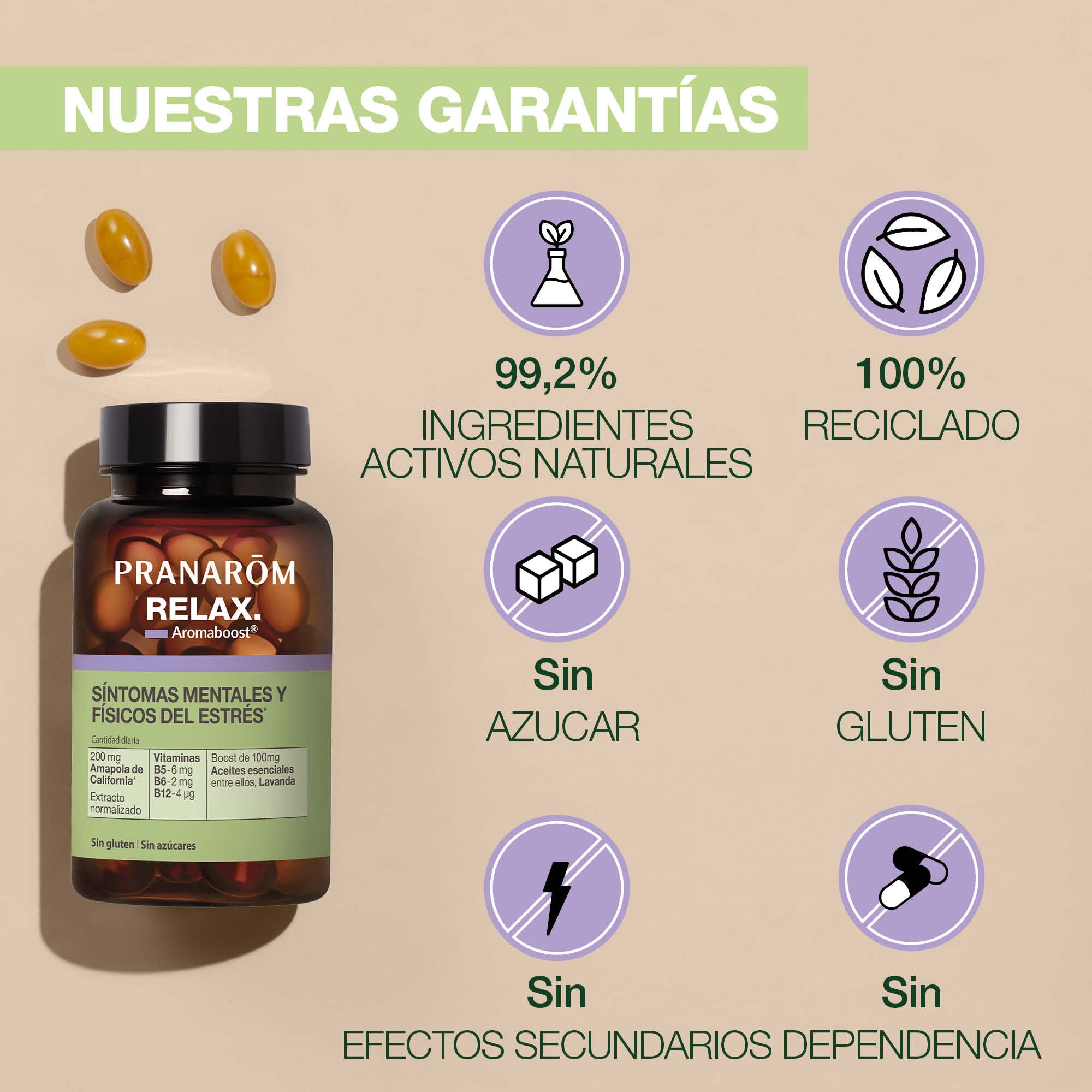 Diseñado para ayudar en la gestión del estrés ocasional, Aromaboost RELAX ofrece una solución duradera para apoyar los signos mentales y físicos del estrés.Ideal durante períodos de intensa tensión nerviosa o para superar la ansiedad ocasional, este complemento alimenticio sin riesgo de dependencia ofrece una mejor gestión del estrés ocasional a largo plazo, con una cura recomendada de 1 mes.Aromaboost RELAX fue probado en un estudio de vida real*:- Reducción del estrés experimentada por el 92% de las personas- Efecto sentido, en los primeros 4 días, por casi el 90% de las personas- El 92% de las personas notaron los beneficios en su nivel de estrésLas cápsulas Aromaboost RELAX obtienen sus virtudes del extracto seco de Amapola de California y de las vitaminas B5, B6 y B12. La fórmula se potencia con una sinergia experta de Aceites Esenciales de Lavanda verdadera, Menta verde y Ravintsara.Las cápsulas Aromaboost RELAX obtienen sus virtudes del extracto seco de Amapola de California y de las vitaminas B5, B6 y B12. La fórmula se potencia con una sinergia experta de Aceites Esenciales de Lavanda verdadera, Menta verde y Ravintsara.Aromaboost RELAX presenta una composición de 99,2% de ingredientes de origen natural, sin azúcar y sin gluten.Composición detallada: - Extracto seco concentrado de Amapola de California: la Amapola de California está indicada para el alivio de síntomas leves relacionados con el estrés mental- Vitaminas B5, B6 y B12: contribuyen al funcionamiento normal del sistema nervioso. 2 cápsulas al día de la cura Aromaboost RELAX cubren al menos el 100% de las necesidades diarias de vitaminas.- Aceites Esenciales 100% naturales, puros e íntegros: la fórmula Aromaboost RELAX está enriquecida con Aceites Esenciales de Lavanda verdadera, Menta verde y Ravintsara, cuidadosamente seleccionados para reducir la tensión nerviosa y contribuir a una relajación óptima.Completa tu ritual alimenticio con el Roll-on RELAX, un gesto simple e instantáneo para encontrar calma y tranquilidad, para llevar a todas partes.*Prueba de consumo realizada por un instituto independiente en 50 personas durante 30 días.