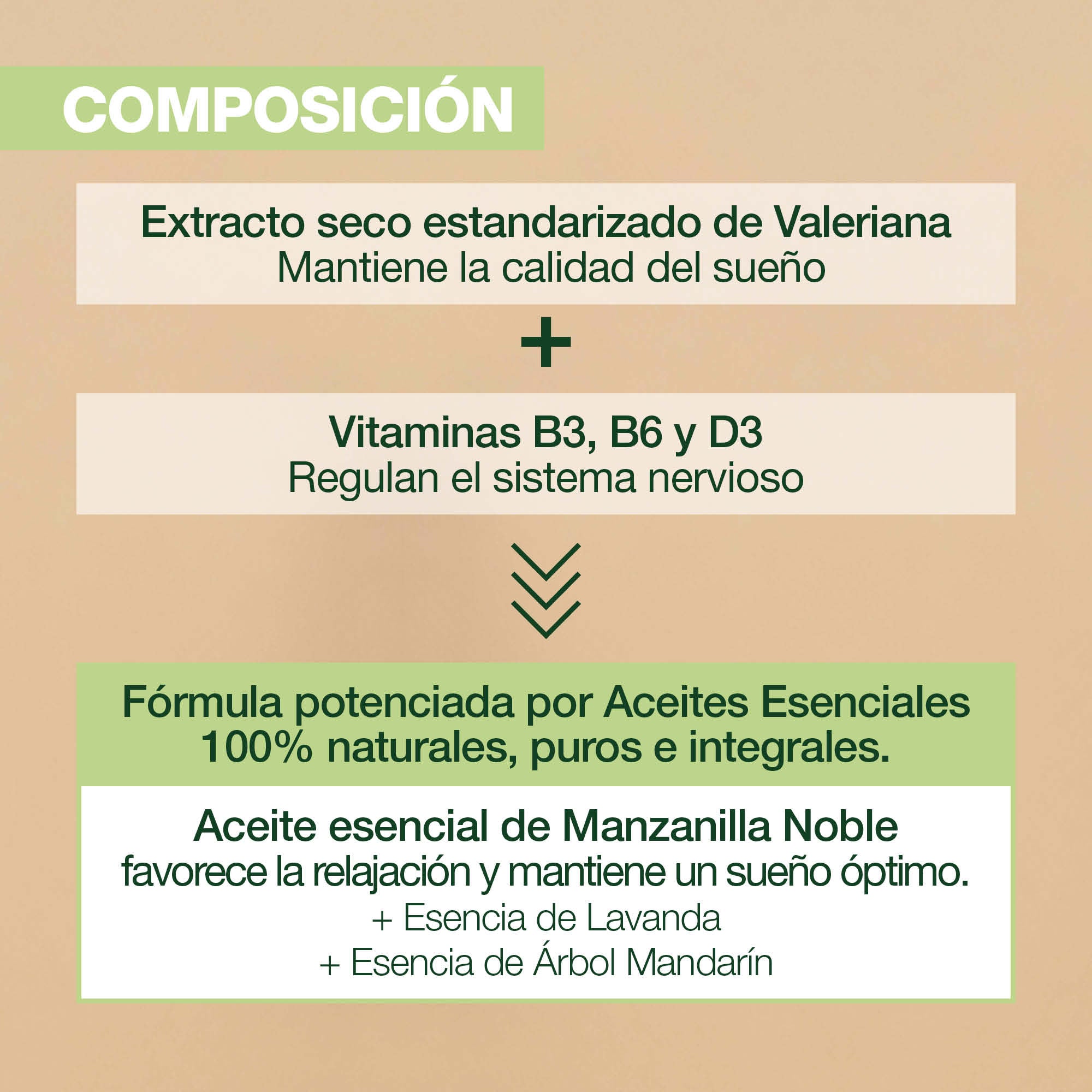 - Extracto seco estandarizado de valeriana: seleccionado por su efecto relajante, la valeriana contribuye a mantener la calidad del sueño.