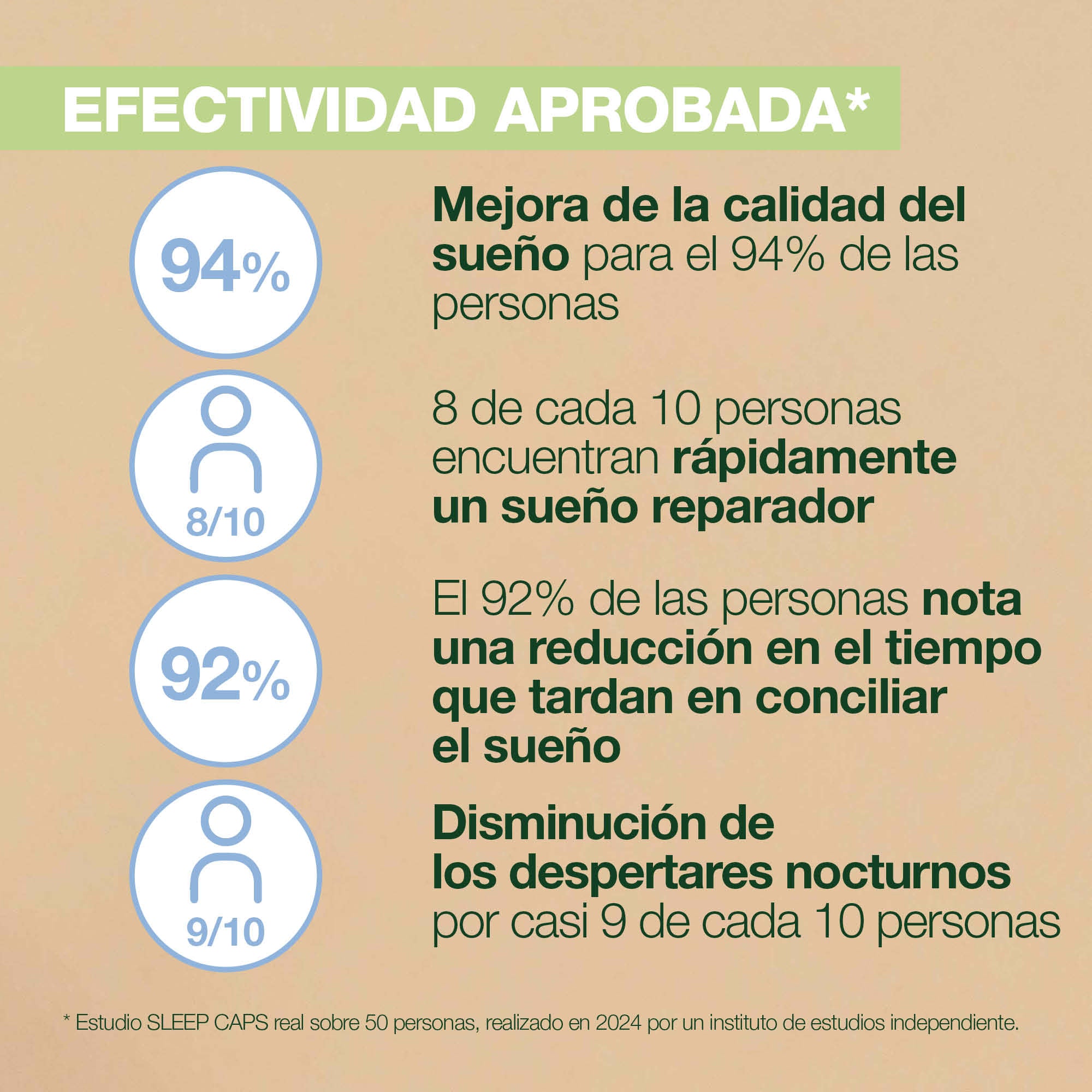 - El 92% de las personas reportan una reducción en el tiempo para conciliar el sueño.
