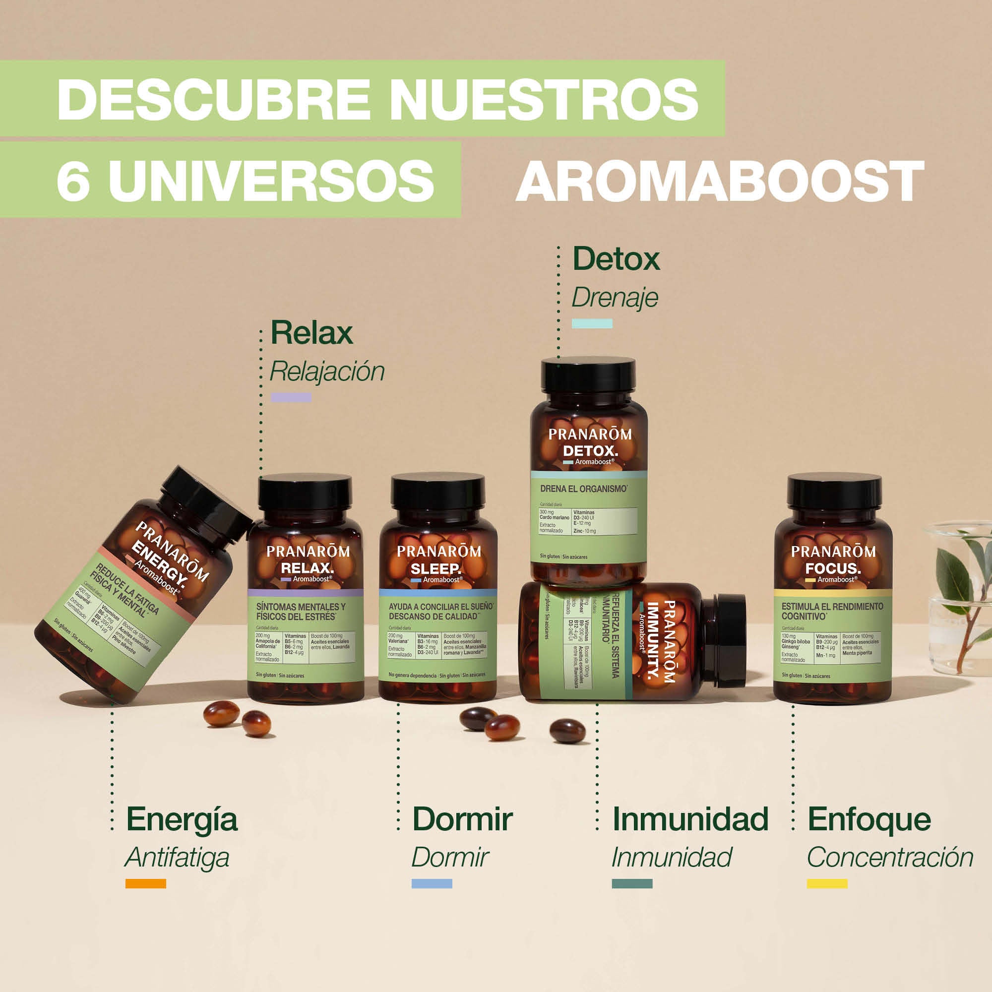 - Vitaminas B3, B6 y D3: ayudan a regular el sistema nervioso. Dos cápsulas por día de la cura Aromaboost SLEEP cubren al menos el 100% de las necesidades diarias de vitaminas.