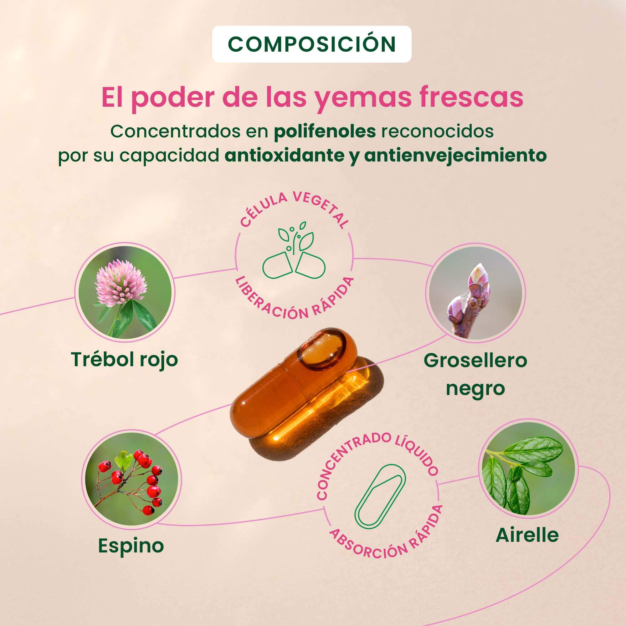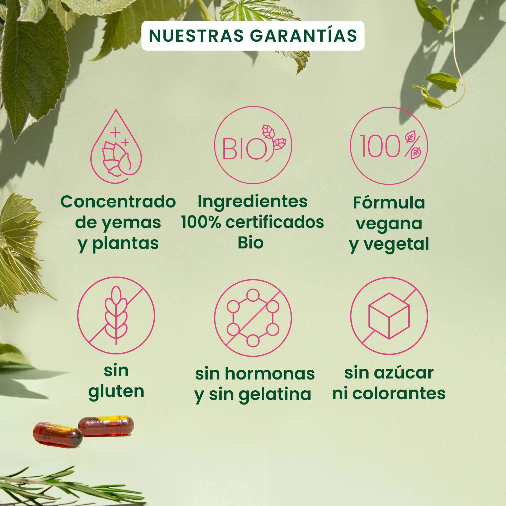 100% de origen vegetal y sin hormonas, GEMMOCAPS® MENOPAUSIA contiene Trébol rojo, que ayuda a reducir los sofocos, y Grosellero negro, que favorece la energía y ayuda con el control del peso. Además, el Espino favorece el sueño. Los brotes frescos y biológicos, naturalmente concentrados en polifenoles, son reconocidos por su capacidad antioxidante y antienvejecimiento.